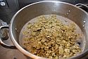 Everything to be used in the beer making process should be bathed in bleach solution (1 TBSP bleach to a gallon of water) and thoroughly rinsed. Use commercial sterilizer if you prefer—I do, but it costs more. Bring two gallons of water to a boil in your largest pot, then add one can of malt extract and one pound of dried malt. For richer beer, add two pounds. I’ve found that the ickiest home brew is usually the result of a too-dilute final product. Keep everything well-stirred to avoid scorching.