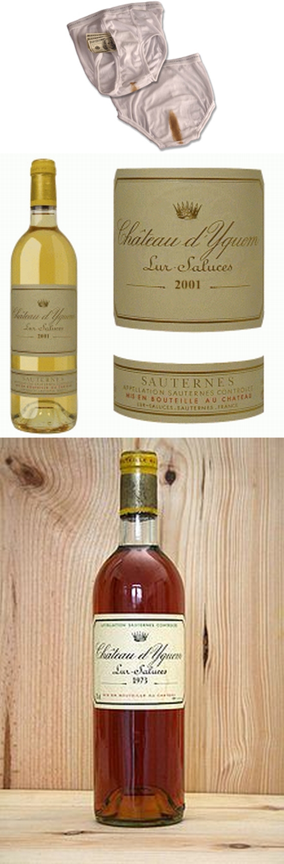 Leakproof Château d’Yquem ‘Funderwear’: His-and-her skivvies with the logo of the famous sugarplum Château silkscreened on the crotch area without the slightest authorization! Let ‘em strip search you, the pervs!